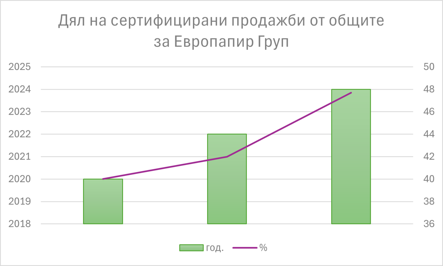 През 2024 г. вече 47.7% от хартията, продадена от „Европапир Груп”, е сертифицирана. За последното десетилие делът на продажбите на сертифицирани продукти в групата е нарастнал с над 15% и тенденцията е да продължим да го увеличаваме. Това е забележително развитие за търговец на хартия на пазарите в ЦИЕ.